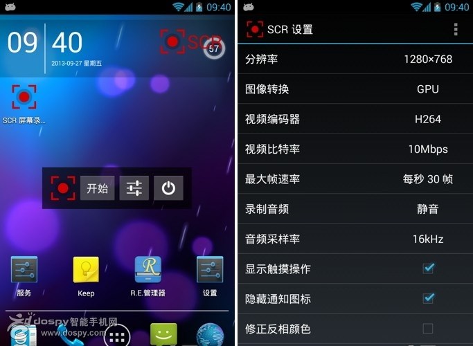 终于找到一款可以在Android 4.0+上进行屏幕录像的工具了,以前的各种屏幕录像工具在Android 4.0+上都彻底残废了,完全不能用,这款SCR Screen Recorder可以在Android 4.0+上完美录制视频。SCR Screen Recorder对设备配置要求也有一定的门槛,不过现在手机市场月月旗舰,一般手机的配置都可以应付。Nexus 4这机子测试录像流畅度还不错,所以配置更高的机型更加不在话下。对于需要录制手机操作视频的筒子来说,这款神器必须必备!